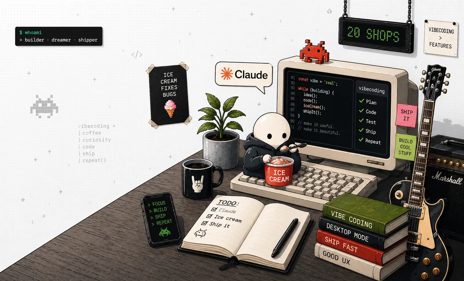 Wrote 12 modules. Recorded 3. Sold 0. Turns out scoop shop owners are outside, running shops.